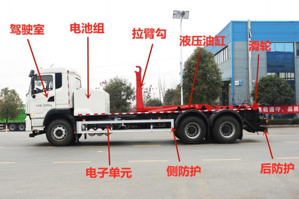 ABS型號:J ABS;ABS生產企業:焦作博瑞克控制技術有限公司;儲能裝置單體種類/生產企業: 磷酸鐵鋰蓄電池/寧德時代新能源科技股份有限公司;儲能裝置總成的生產企業:寧德時代新能源科技股份有限公司;驅動電機:TZ370XS-LKM1103,功率(KW):160;側面防護裝置材料采用鋁合金,連接方式為螺栓連接,后防護裝置材料為Q235A,連接方式為螺栓連接,后部防護裝置的斷面尺寸為:60×120(mm),離地面高度450mm;專用功能及裝置:液壓缸、拉臂鉤等專用設備,實現對垃圾的裝載及卸料的作業功能.選裝直供電的ETC車載裝置,安裝具有衛星定位功能的行駛記錄儀,選裝限速裝置,限速89km/h;長度/前懸(mm)對應關系:7420/1400;7450/1430