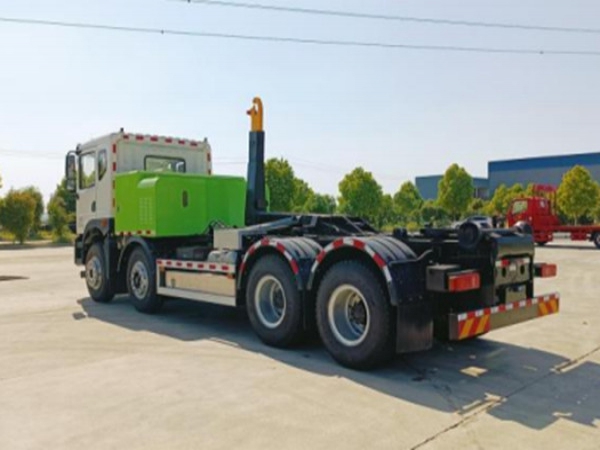 隨底盤選裝電池護罩,輪輞,踏板;側面防護裝置材料為鋁合金,與底盤縱梁采用焊接連接;后下部防護裝置材料為Q235,與車架螺栓連接,截面尺寸:120×60mm,離地高度為445mm;動力蓄電池種類:磷酸鐵鋰蓄電池,生產企業:寧德時代新能源科技股份有限公司;驅動電機類型:永磁同步電機,驅動電機功率:360kW,生產企業:陜西法士特齒輪有限責任公司;ABS型號:CM4XL-4S/4M;ABS生產企業:廣州瑞立科密汽車電子股份有限公司;該車安裝具有衛星定位功能的行駛記錄儀;專用功能及裝置:液壓缸、拉臂鉤等專用設備,實現對垃圾的裝載及卸料的作業功能.可選裝ETC車載裝置.長度(mm)/后懸(mm)/離去角(度)對應關系:9600/1590/20,9450/1440/21,9300/1290/22,整備質量(kg)/額定載質量(kg)對應關系:14150/17720(2人),17655(3人),14450/17420(2人),17355(3人),14850/17020(2人),16955(3人)