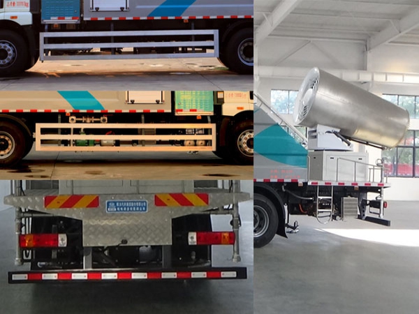 1. 介質:抑塵劑,有效容積7.31立方米,總容量7.67立方米,罐體總長2700mm,截面(寬*高mm)2450*1300; 整車長/前伸/后伸對應關系(mm):11350/550/1000,11200/550/850,11070/550/720,10800/0/1000,10650/0/850,10520/0/720,10350/550/0,9800/0/0;2.側防護防護裝置采用鋁合金材質,后下部防護裝置采用Q235材質;側,后下部防護均采用螺栓連接,后防護尺寸(高×寬):120×60(mm),離地面高度440mm; 3.儲能裝置單體種類/生產企業: 磷酸鐵鋰電池/寧德時代新能源科技股份有限公司;儲能裝置總成的生產企業:寧德時代新能源科技股份有限公司;驅動電機型號TZ370XS-LKM1101對應電機控制器型號KTZ54X45S-LKC1101,功率:160(KW);驅動電機型號TZ366XS50EA對應電機控制器型號KTZ54X40SP5S;功率:180(KW); 4.ABS系統生產廠家/型號 :1.長春科密汽車制動有限公司/CM4XL.2.WABCO/44600XXXX0;5.專用功能及裝置描述:噴霧系統裝置,儲液罐,氣控系統,主要用于道路,廣場或固定場所降塵等作業功能;選用5300mm軸距,選裝不帶前置高炮,選裝后部噴灑裝置