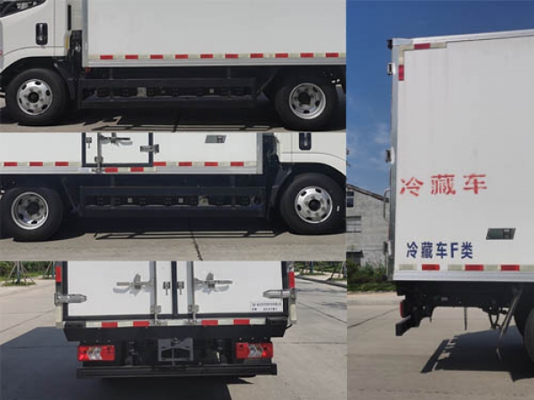 選裝制冷量相同的制冷機組,選裝廂體無側門結構,選裝車輪外觀,選裝前部車型標識外觀。車廂頂部封閉,不可開啟。氣剎ABS系統型號/生產企業:VIE ABS-II/浙江萬安科技股份有限公司,選裝液剎ABS系統型號/生產企業:3550A500/浙江亞太機電股份有限公司。電池種類/單體生產企業/總成生產企業: 磷酸鐵鋰蓄電池/寧德時代新能源科技股份有限公司/寧德時代新能源科技股份有限公司。側防護采用冷彎型鋼/Q235-B,螺栓連接;后防護采用冷彎型鋼/Q235-B,焊接連接,截面尺寸(寬×高)(mm):50×100,離地高度為:450mm。選裝采用直接供電方式的ETC車載裝置。整備質量不包含隨車工具,備胎,最小尺寸貨廂重量900kg,最大尺寸貨廂重量995kg,貨箱材質為玻璃鋼+聚氨酯泡沫,厚度80mm。